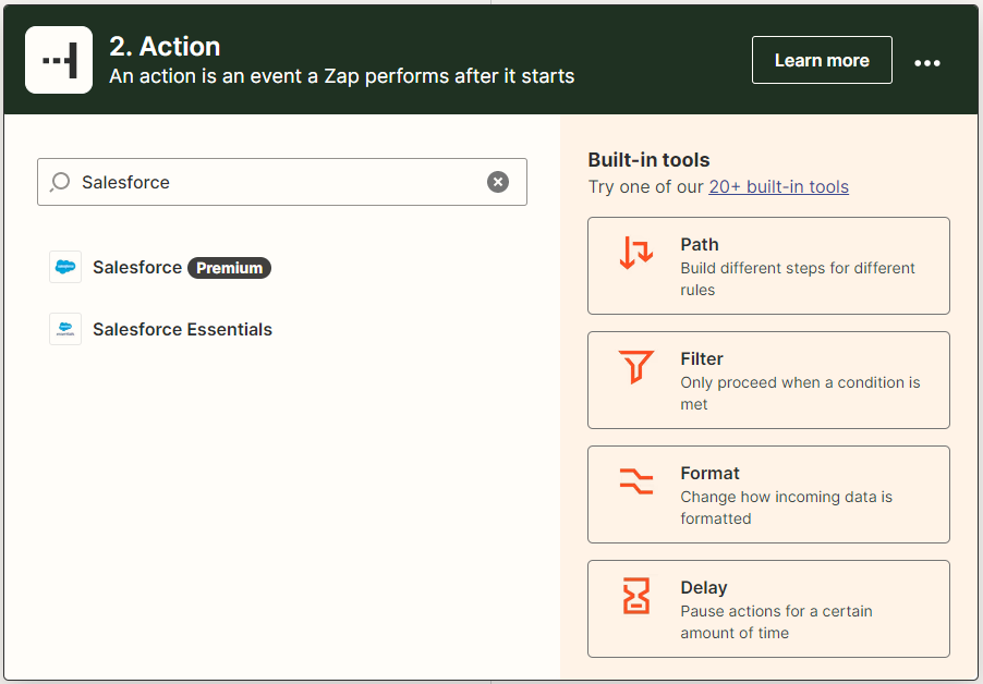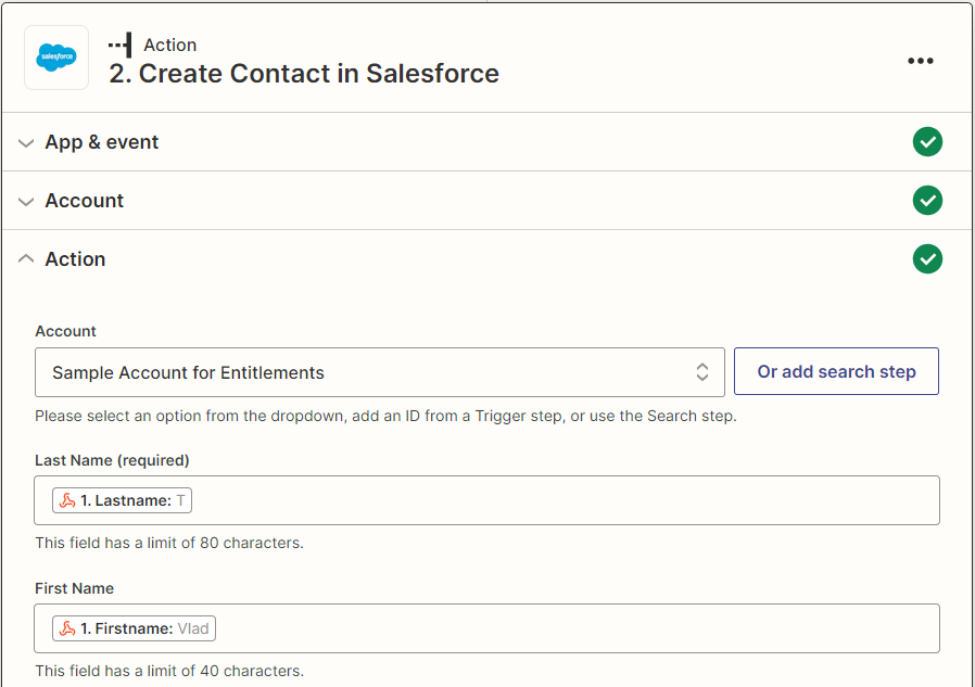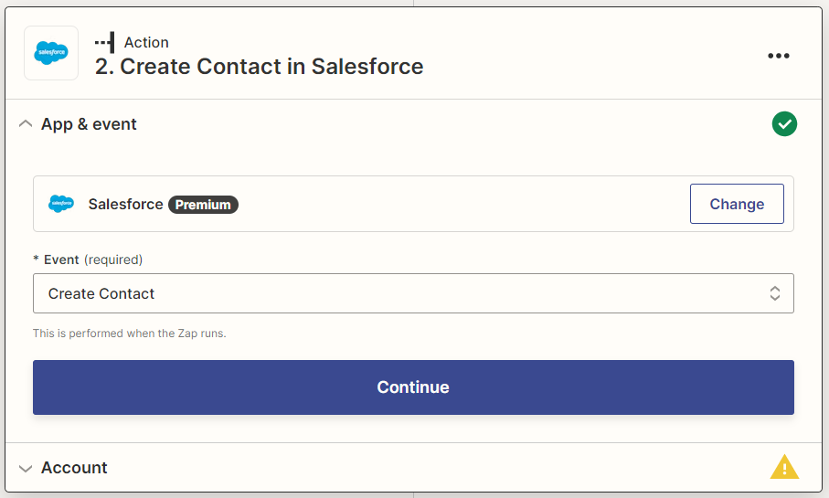 Choose an event to integrate once Zap is activated. I want to add a new contact to my Salesforce account in our example.